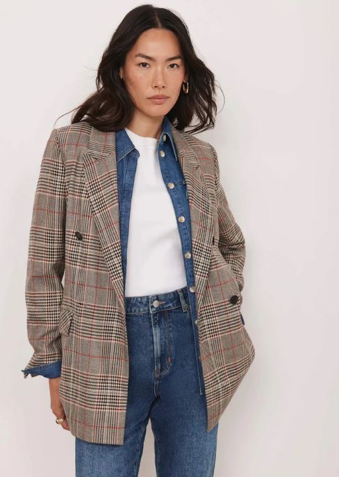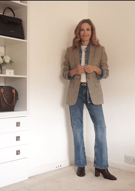 Essentially, it’s just made up of five basic pieces: a white t-shirt, which could be long or short sleeved; a denim shirt, which you really should consider adding to your wardrobe if you don’t already have one because they’re just so versatile. The model is also wearing blue jeans in the same color way as the shirt, a check blazer, and boots.