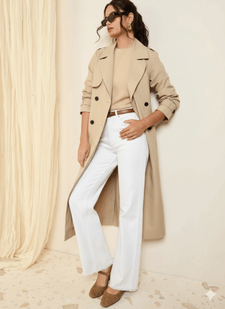 This is quite a classic outfit formula that’s just been modernized with up-to-date pieces. So the basic formula is beige top to match the beige trench coat, white jeans and nude Mary Janes.