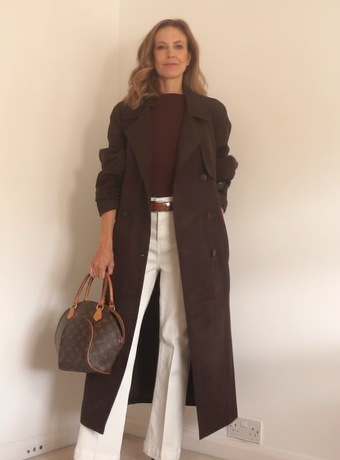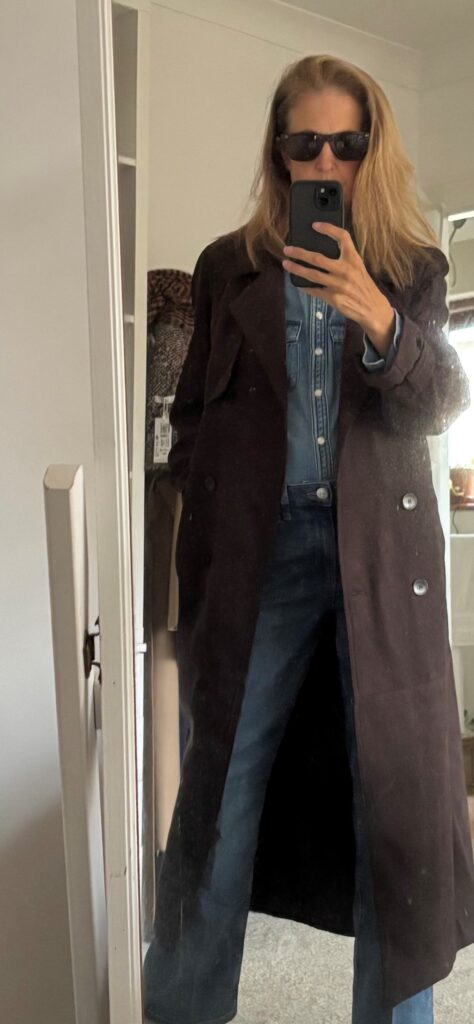 Now, I tried it very quickly with the pieces that I had and I really like the colour combination. So, even if you don’t have a brown suede trench coat, but perhaps a brown jacket or a coat, you could try it with the double denim. It may be a new outfit idea that you could add to your wardrobe.