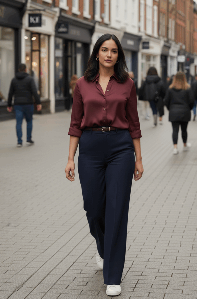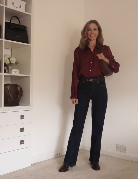 So, this outfit formula basically consists of dark indigo jeans or navy trousers, a burgundy blouse, burgundy boots, and bag. But if you do need an extra layer for this outfit, try green with it. It goes fabulously well with burgundy.