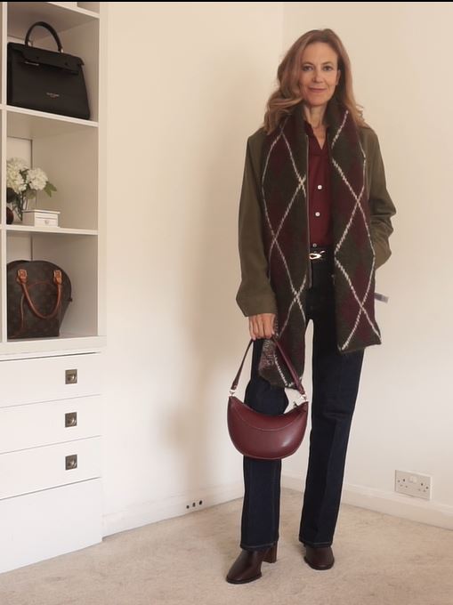 This is a green sort of suede jacket from Marks and Spencer again. And then I’ve layered that with an Argyle pattern scarf which has both the colors in it.