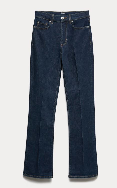 So, I’ve done this look myself. It’s a mix of old and new. The jeans are new and they’re in a cream colour with a flare and a front seam. And these are from M&S. These are a great shape and because of the pin tuck crease down the front of the leg, it can really elongate the legs. These have got a zip fly fastening which I prefer and a high waist so there’s plenty of tummy control.