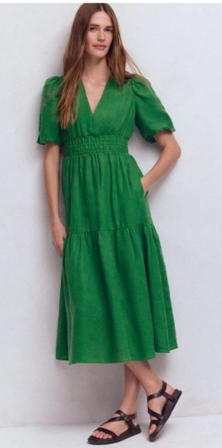 Nude shoes or boots with a green midi dress create a seamless leg line, which is why they’re the most popular choice.